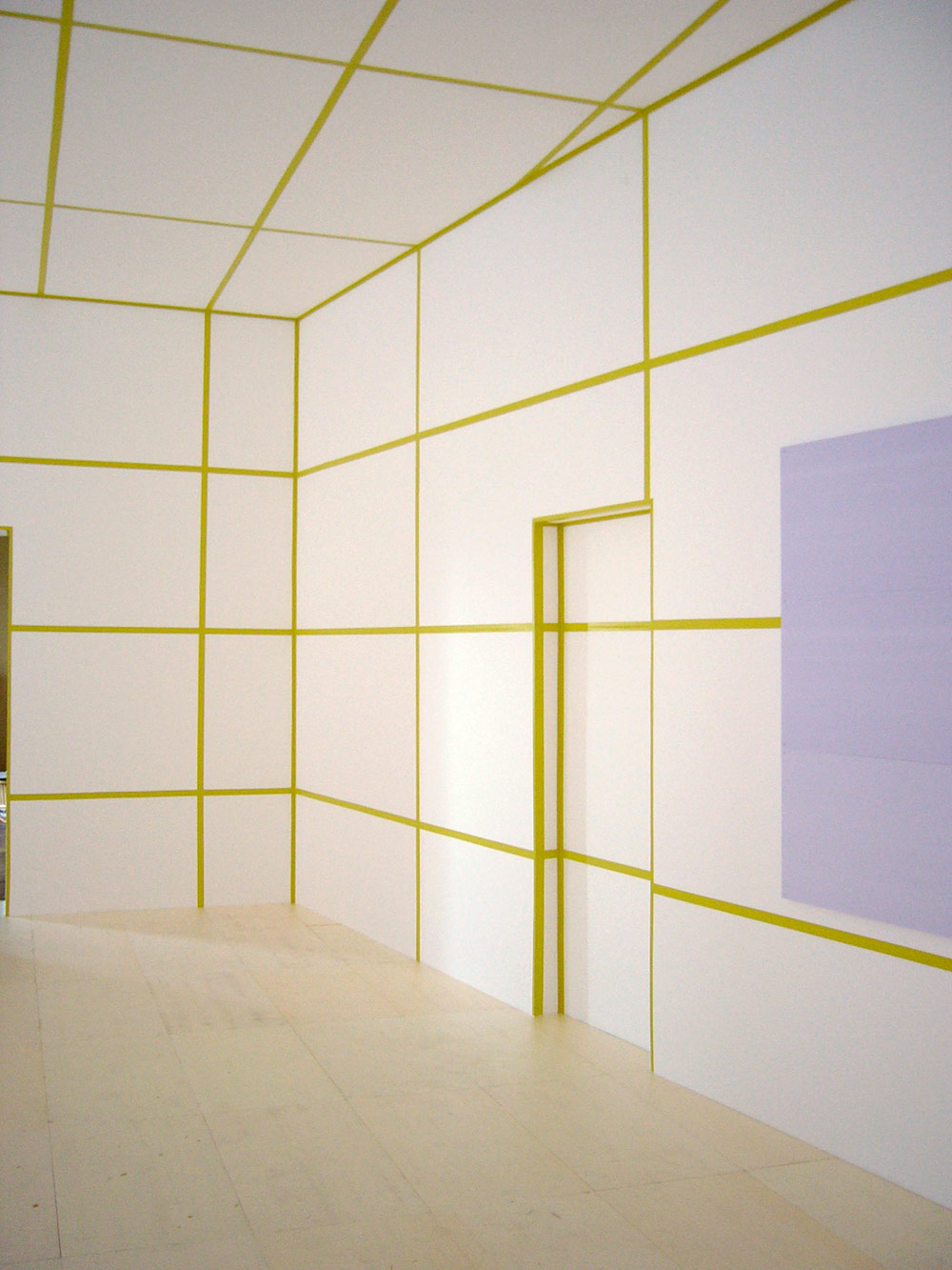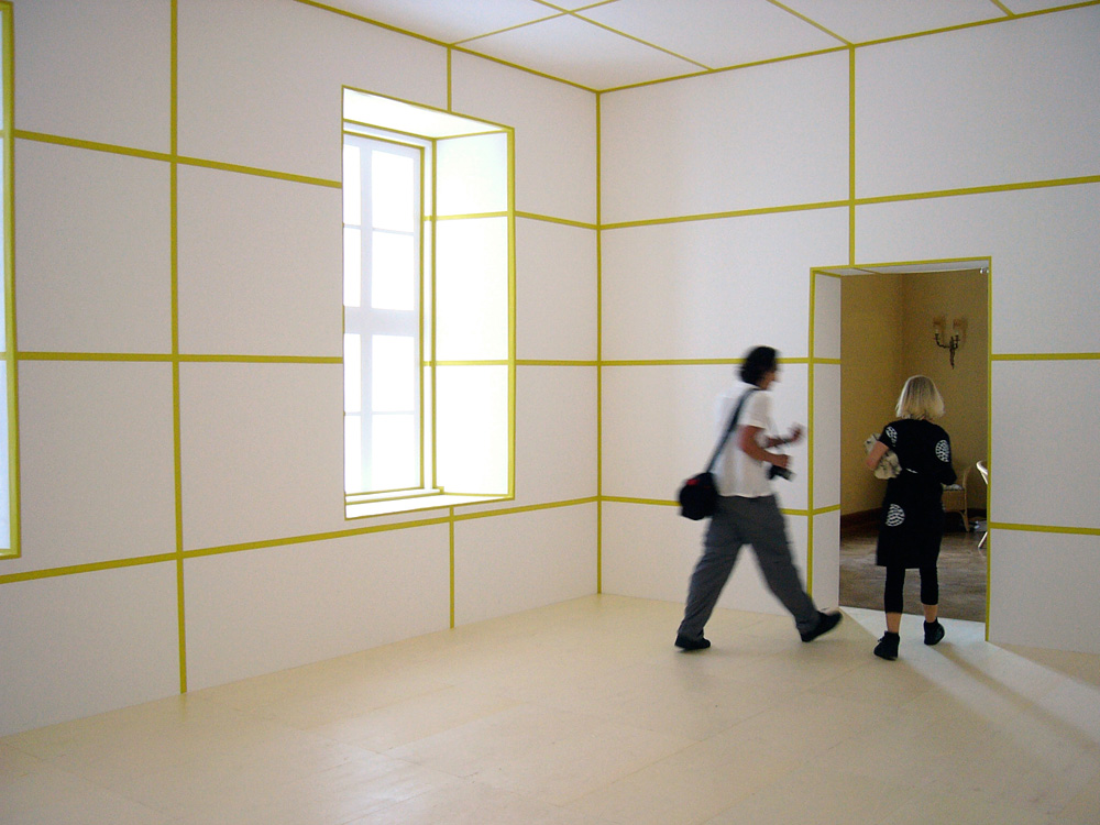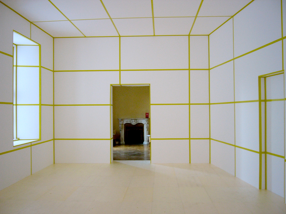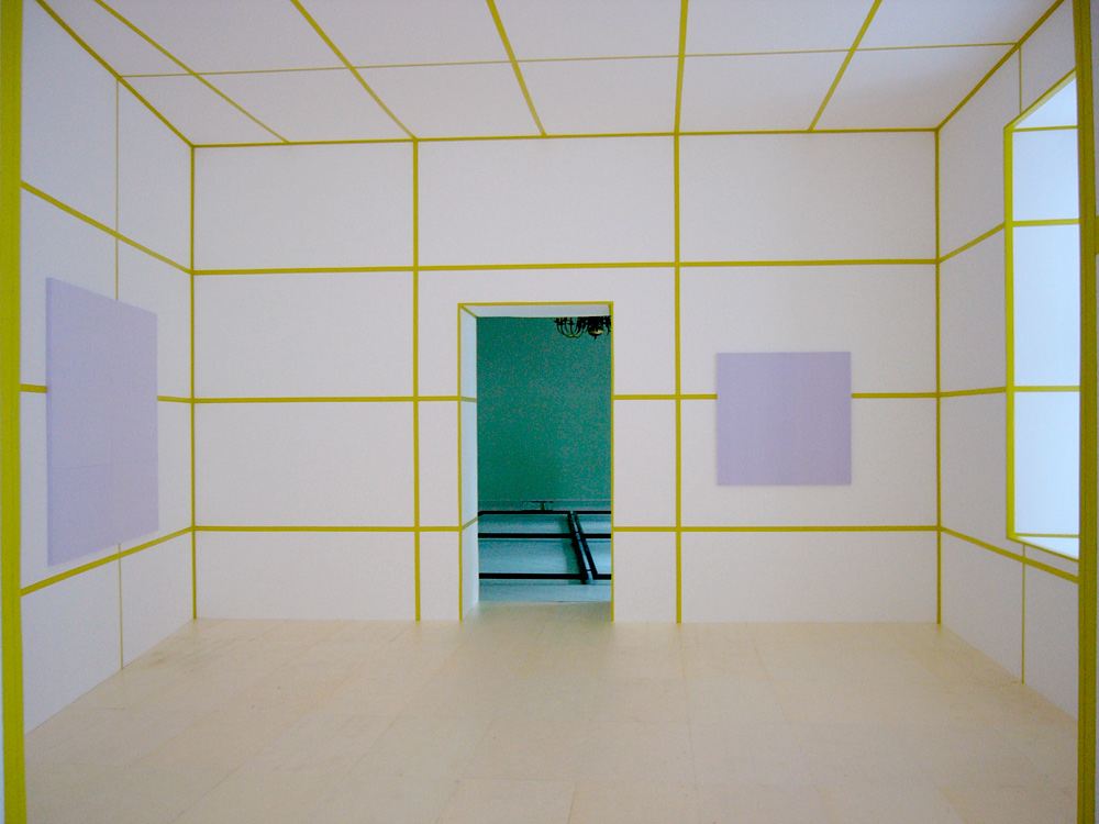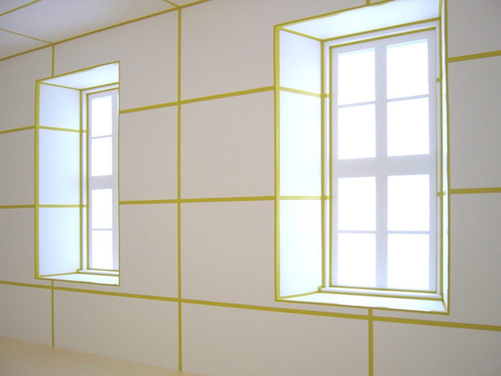 The work Pin-up was built in the “Yellow Room”, one of the many historical rooms in the neo-Gothic Wolfsberg castle. A mock-up of the room was produced using polystyrene boards. With its coloured adhesive bands and differently coloured boards, the installation refers back to the most primary structure of the room.