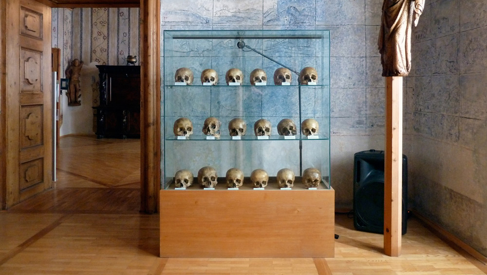 When a someone enters the museum room an unexpected noise is perceived. At first the sound’s source and cause cannot be discerned. After a while the visitor will realise that they themselves are producing the sound – as they walk through the space the old wooden floor transfers the sound of their footsteps over to the skull-filled glass showcase. The back glass vibrates and the microphone transmits this sound into the active speaker which amplifies it and makes it “visible” to the visitor.