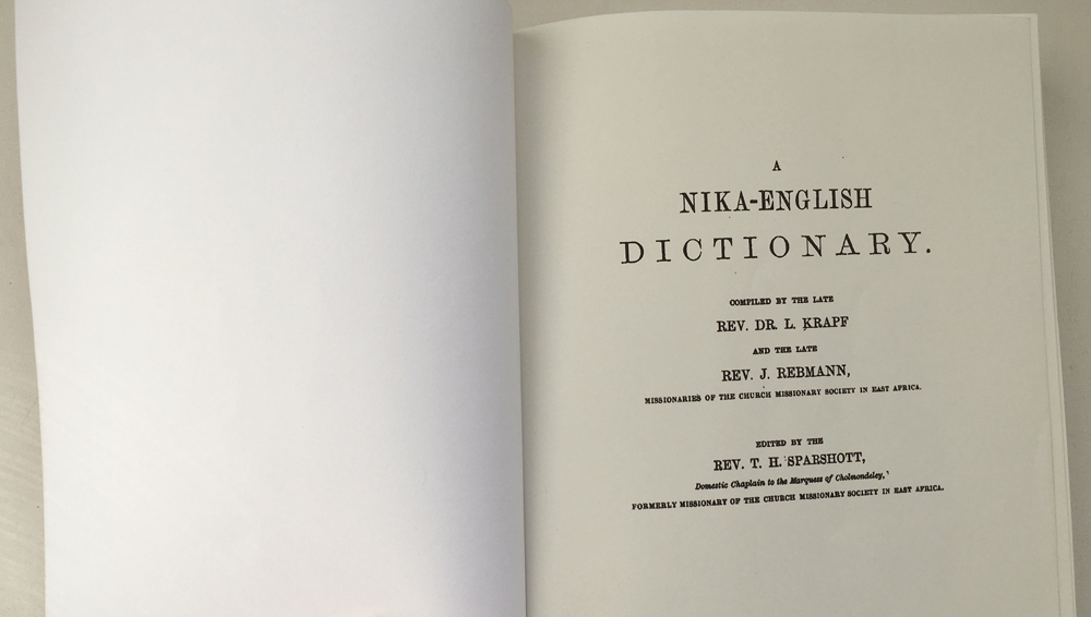 One day while googling my name, I came across A Nika-English Dictionary. The Nika language was one of the tribal languages spoken in southeast Kenya. The dictionary was compiled by the missionary Johann Ludwig Krapf and published in 1887 by the Church Missionary Society in London (eight years later Kenya was declared an English protectorate and later a British colony).